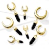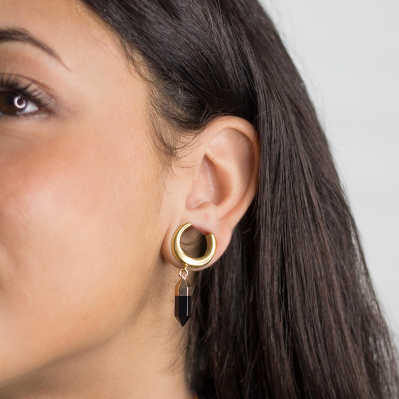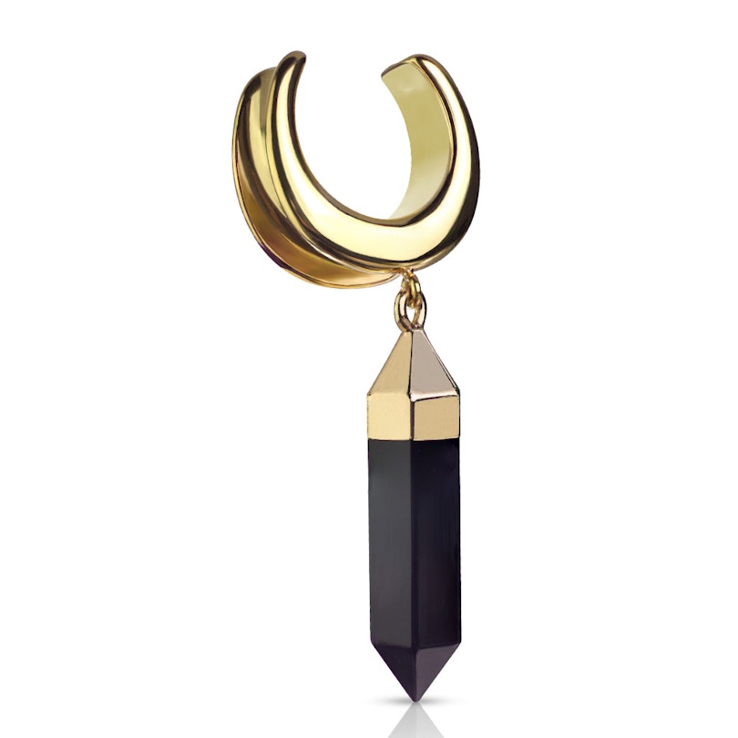 Om du har töjt ditt öra känner du säkert till problemet med att inte kunna bära smycken med hänge. Men det kan du med denna saddle spreader som inte kan kategoriseras som varken en plugg, tunnel eller taper. Det är ett helt unikt smycke. Smycket är öppen på toppen där kanterna är nedlutade för att omge din örsnibb. Du ska ha ett hål på minst 10 mm i örat för att kunna använda smycket. I gengäld behöver du inte begränsa dig till 25 mm. Du kan bära den största modellen på 25 mm, om ditt hål är över 25 mm. Som nämnt så är det ett hänge på denna modell. Den består av en prisma formad stav av svart harts.