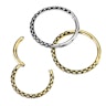 Den här segmentringen med gångjärn har ormskinnsdesign för en vacker look och känsla. Smycket finns tillgängligt i silver- och guldfärger och båda har genomgått en oxiderande process för att få en ormskinns-look. Ringen kommer i två storlekar: 8 och 10 mm, med en trådtjocklek på 1 mm och 1,2 mm.