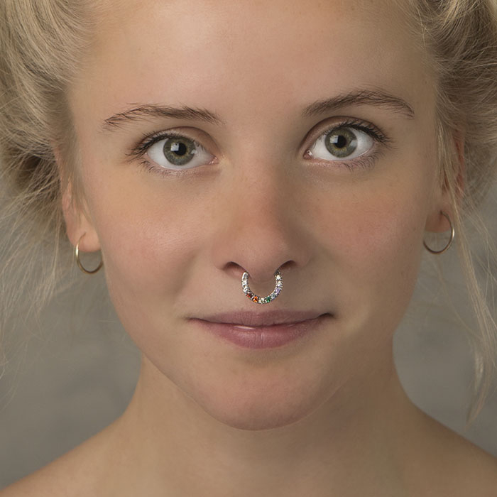 Ifall du har satsat och skaffat dig en riktigt vacker och elegant septumpiercing så har vi det helt perfekta smycke till dig här. Denna vidunderliga septumpiercing är både klassisk och präktigt i sin design på en och samma gång. Den cirkelrunda halvbågen är dekorerad med hela 10 vidunderliga stenar som närmast glittrar och glimtar i kapp med varandra.