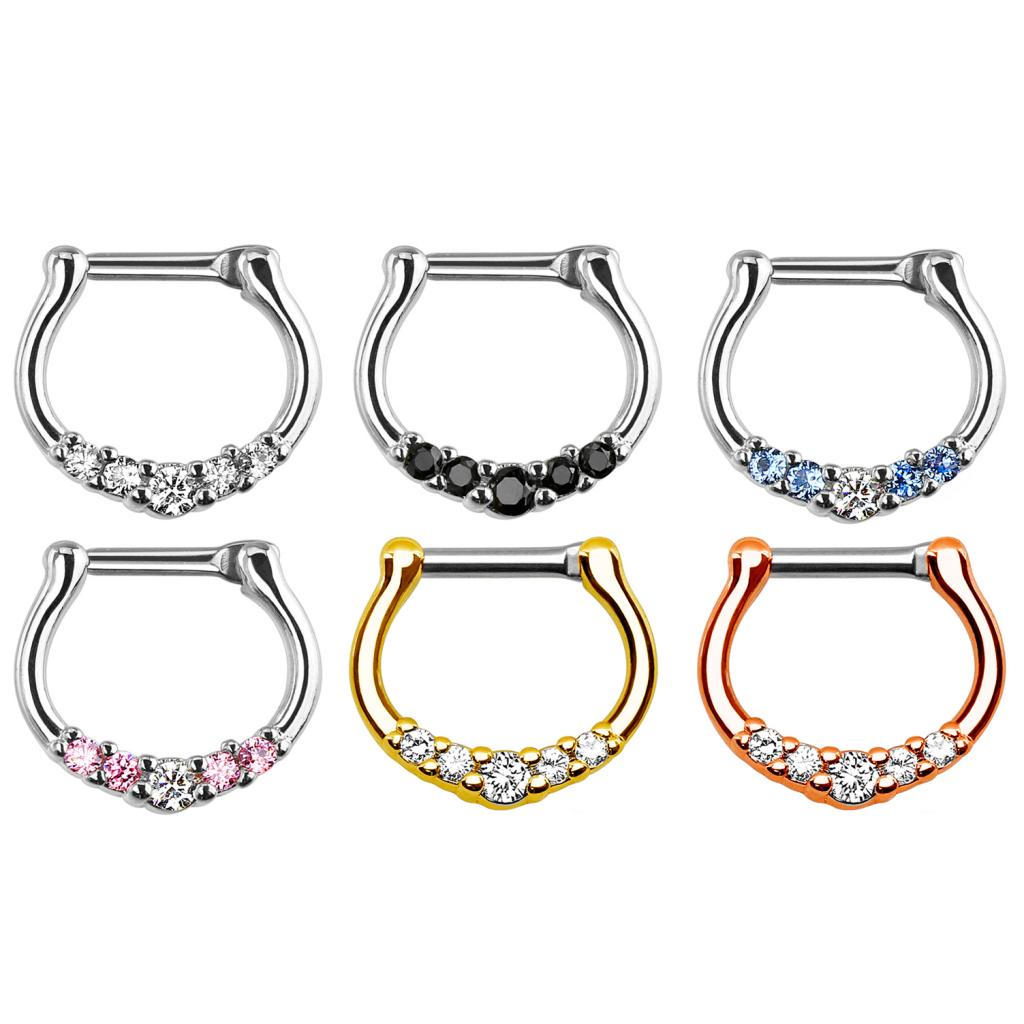 Väldigt vacker och feminin septumclicker av ren kirurgiskt stål som är utrustad med fem alldeles vanliga men bedårande stenar. Den sten som sitter just i mitten är lite större än de fyra andra stenarna, vilket bra kan ge det intryck att ringen är enkel droppformad. Det är den stora stenens placering som ger denna septumpiercing det extra lilla tvist i designen.