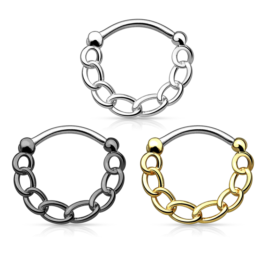 Själva ringen är formad som en kedja som ger smycket ett liten rå look jämfört med den vanliga prinsessa touchen med sten och glitter till den helt stora guldmedaljen. Kedjan är så diskret visar svetsat ihop i varje enkelt led så den behåller sin form när smycket är vid användning. Den är med andra ord "stel" i raden så kedjan klapper alltså inte ihop när smycket sitter i din septumpiercing. Den kommer att däremot hålla sin snygga runda form.