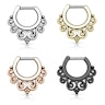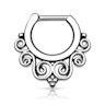 Smycka ut din septum med mjuka vågor som snor sig i ett S-format mönster på undersidan av denna vackra septumclicker. Det tvinnade vågiga mönstret är fullständigt symmetriskt med två stora snygga vågor som möts på mitten där de avslutas med tre små kulor som binder mönstret samman.