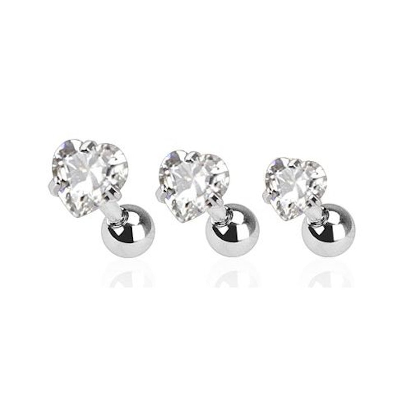 Detta set kan användas till nästan alla öronpiercingar så länge piercingen är gjord hos en piercare som har använt sig av en nål. Setet består av tre delar av ett smycke i tre olika storlekar. Det är med andra ord ett smycke med ett stort hjärta, ett smycke med ett mindre hjärta och till sist ett smycke med ett litet hjärta. Det är naturligtvis svårt att ange diametern på en form som inte är rund, men hjärtana mäter ca. respektive 3 mm. , 4 mm. och 5 mm.