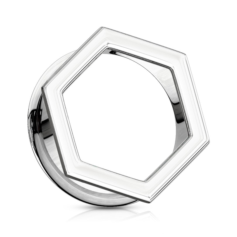 Denna tunnel är gjort av kirurgiskt stål med en sexkantig framsida. Smycket har en förhöjd baksida, därför kallas denna tunnel också en ”double flared tunnel”, som säkrar en bra passform. Med denna förhöjning har det inte heller varit nödvändigt att utstyra tunneln med en skruvgänga. Den kan dock vara en aning svår att få i, sedan ska man vrida smycket in i örat – men övning ger färdighet.
