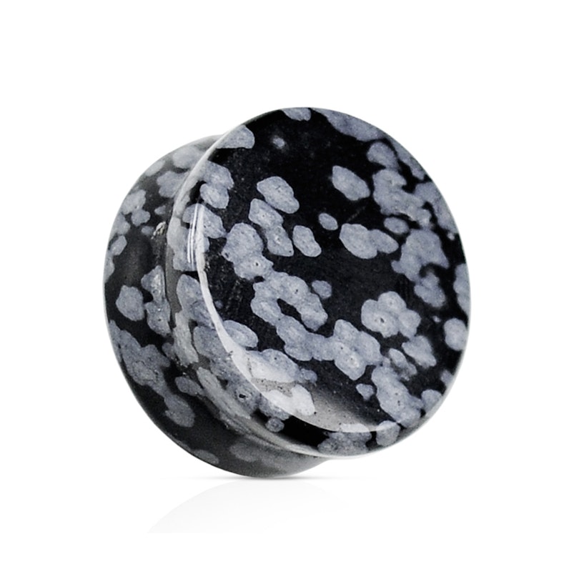 Denna plugg har en otroligt komplex design. Snowflake Obsidian är en helt unik "underart" av stenen Obsidian som är en vulkansk bergart. Pluggen är gjord av 100% massiv snowflake obsidian, men låt det inte skrämma dig. För även om det är en sten så är vikten otroligt lätt.