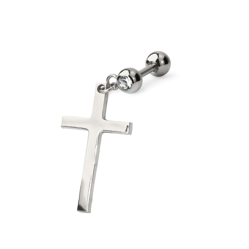 Den här staven passar bäst t i örat på grund av sitt mått. Staven är bara 6 mm lång och 1,2 mm tjock. På framsidan och baksidan sitter en kula på 4 mm. Kulan på framsidan har en liten klar sten. Under samma kula sitter det ett fritt hängande kors som dinglar fram och tillbaka när du rör dig. Korset är ca. 20 mm högt och 12 mm brett och finns tillgängligt i tre färger. Färgen är detsamma på hela smycket, så om du exempelvis väljer den svarta modellen, kommer både kors, stav och kula vara svart. Stenen förblir alltid klar.