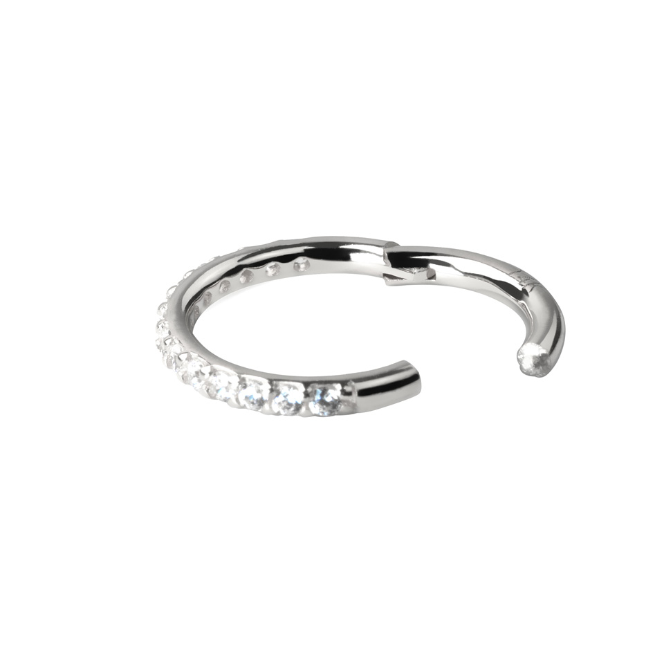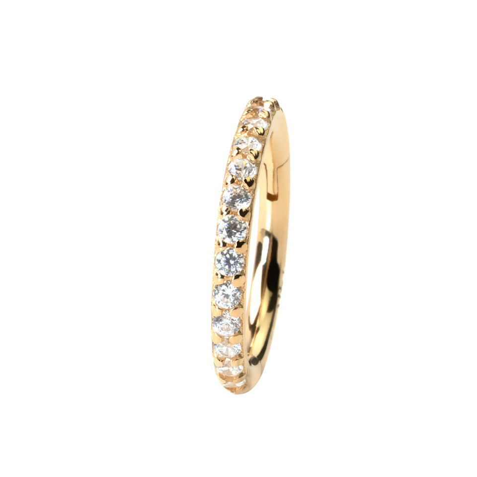 Gångjärn på ringen är fantastiskt. De är otroligt enkla att öppna och stänga samtidigt, så man behöver inte bekymra sig att smycket faller ut. Gångjärn sitter på en ring som är gjort av 14 karat guld, som du kan få i flera utgåvor - bland annat den eleganta 14 karat vittguld. På yttersidan av den synliga delen av ringen sitter det en lång rad av små klara stenar som pryder smycket.