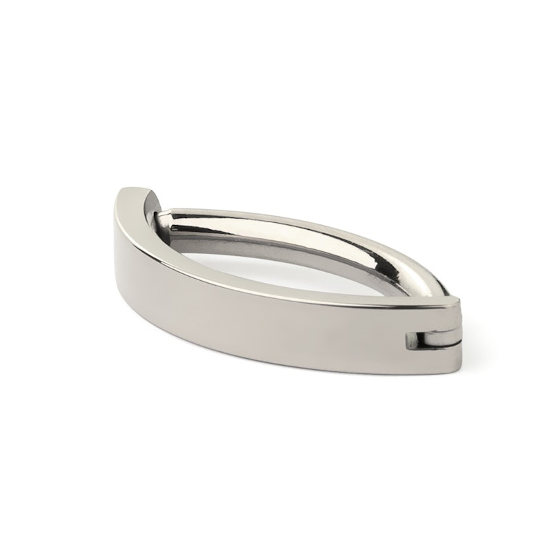 Den lätt böjda kurvan hos denna clicker för naveln gör att den sitter tätt mot kroppen än en vanlig ring, vilket gör den väldigt praktiskt att bära. Den är tillverkad i titan i implantatklass vilket innebär att den är allergivänlig, lätt och hållbar.