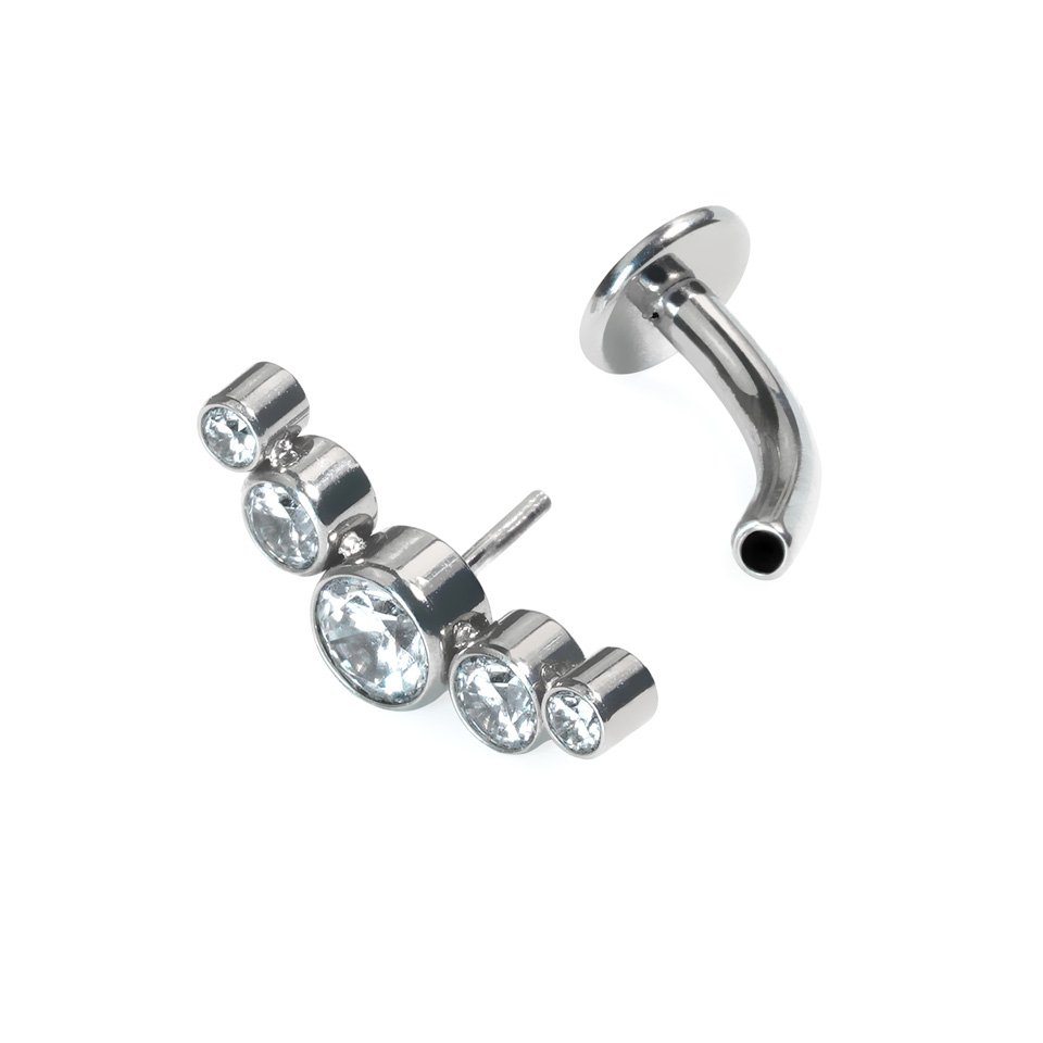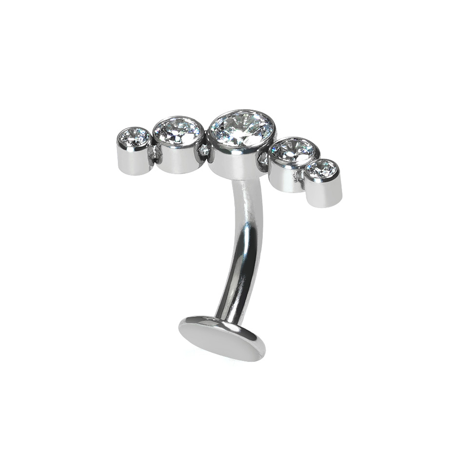 Denna svävande navelpiercing pryds av fem bezelfattade kristaller. Eftersom det är tillverkat av titan är det både allergivänligt och vattentätt. Smycket låses med en push-in teknik, vilket betyder att för att fästa den i din piercing behöver du bara böja stiftet lite och trycka in den i staven.