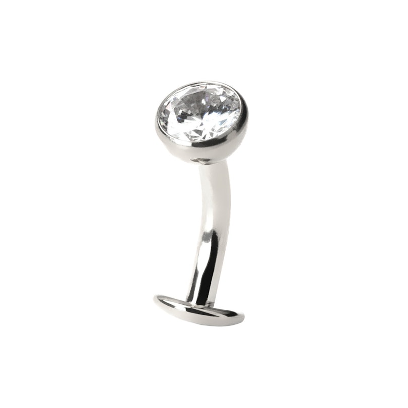 Denna flytande eller omvända navelring med en inramad CZ-sten i toppkulan, alltså sitter den över din navel. Den andra delen av barbellen är en platt skiva som sitter diskret i naveln, vilket ger intrycket att smycket svävar.