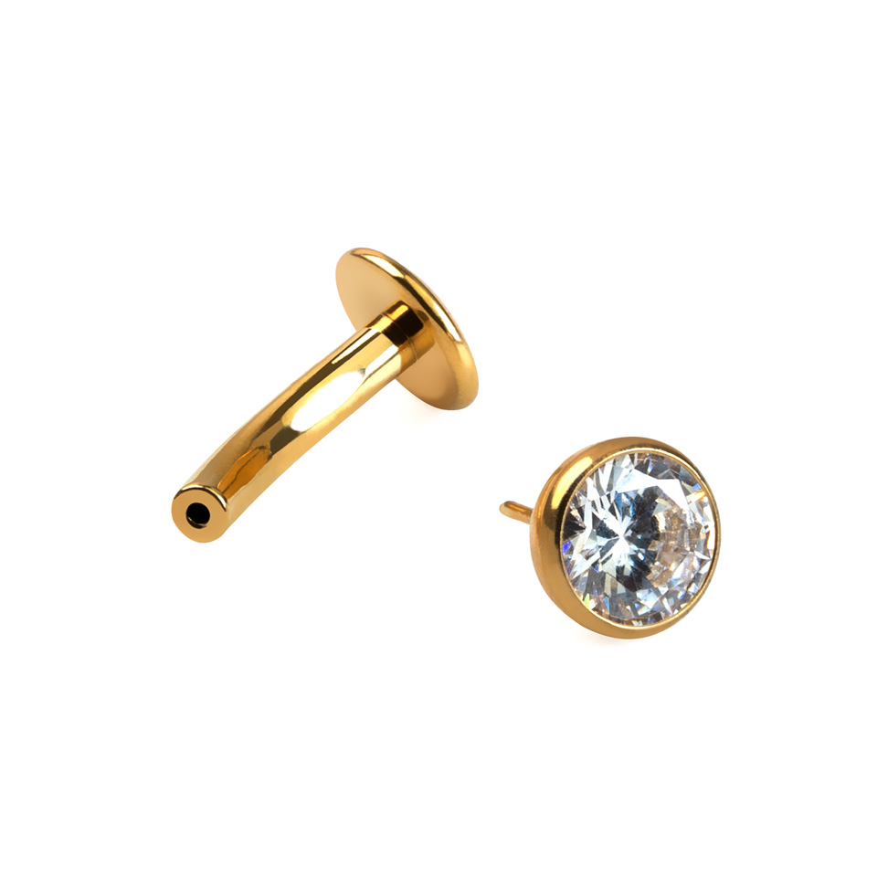 Toppkulan med sin sten och bottenskivan är båda 5 mm. Detta smycke är tillgängligt i färgerna guld och silver.