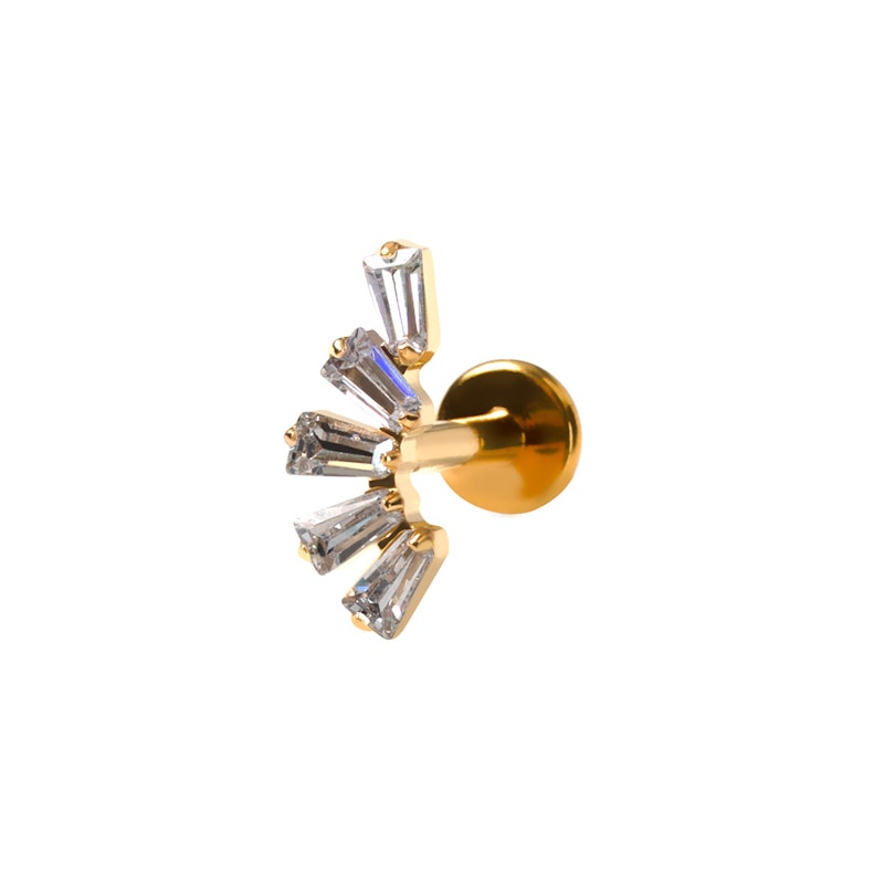 Denna titanlabret med baguetteslipade stenar är gjord för stunder som kräver struktur. De baguetteslipade stenarna radas upp fint och prydligt, och staplas snyggt på ditt öra för en look som handlar helt om balans.