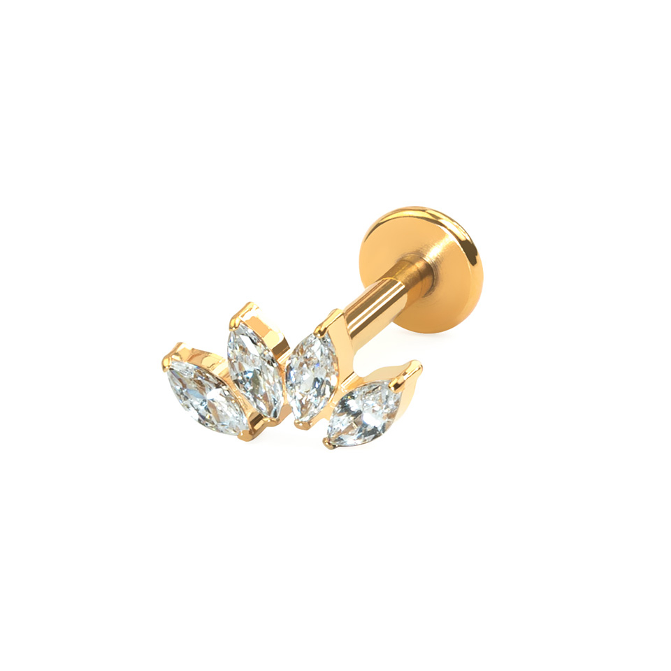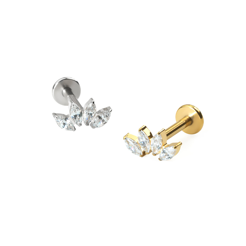 Denna fina labret består av 4 marquise-slipade CZ-stenar arrangerade i en båge. Perfekt för flera olika öronpiercingar, men speciellt till conch eller flat piercing. Smycket har invändig tråd, vilket betyder att staven smidigt träs igenom piercinghålet och sedan skruvas toppen på för att hålla det på plats. Då det är tillverkat av titan är det bekvämt att använda, även för de med känslig hud.