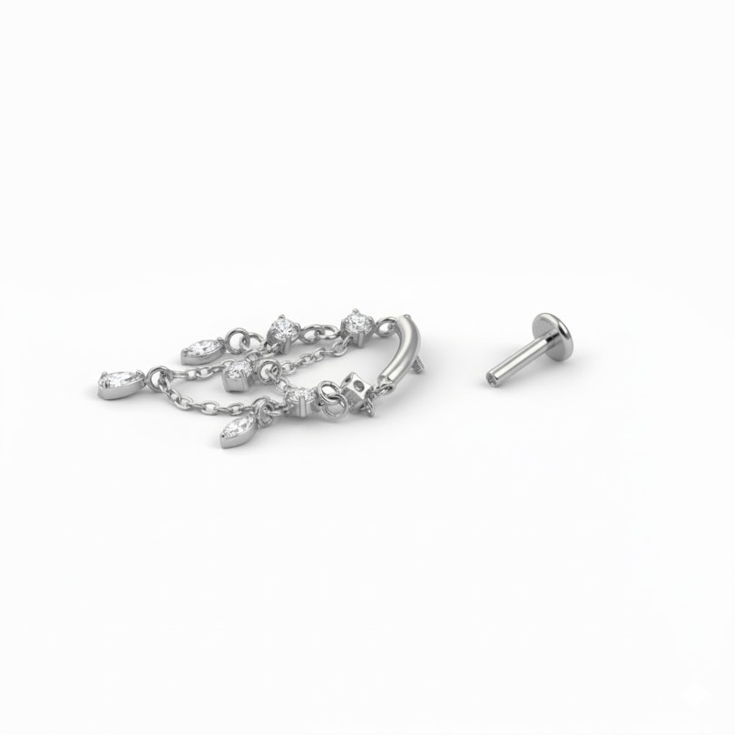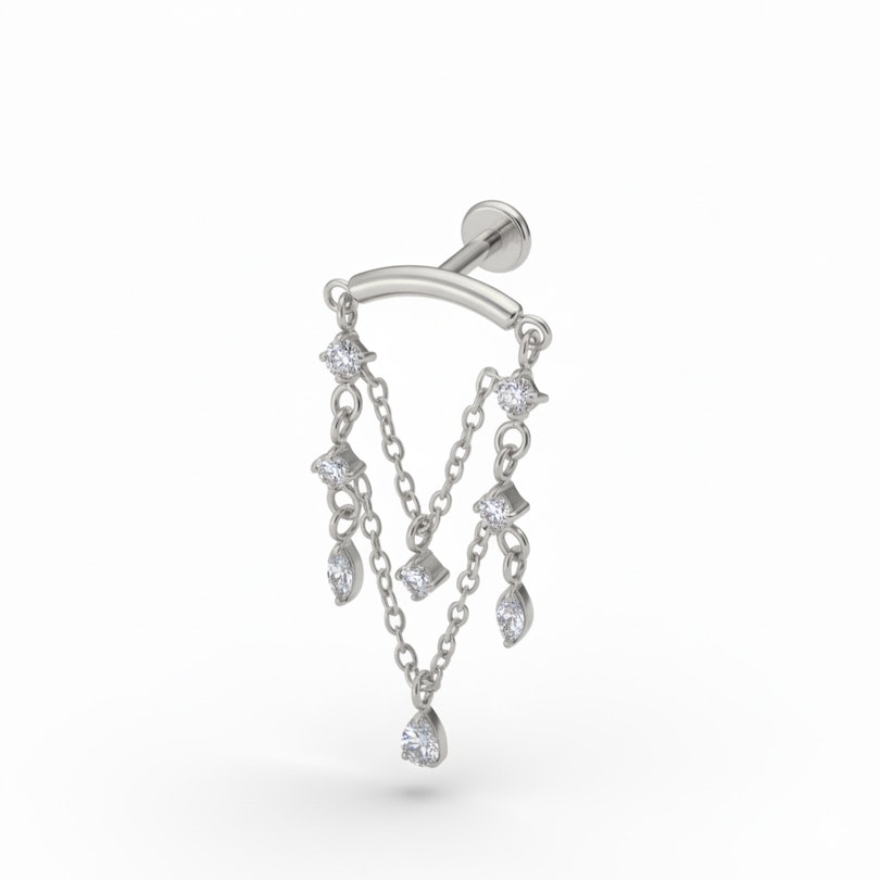 Denna titanlabret med kristallkroneeffekt handlar om rörelse. Små stenfattade droppar hänger under labretten och ger en mjuk livlighet som du märker när du vrider på huvudet. Känns uppklätt utan att vara för mycket och funkar perfekt när du vill ha något lite annorlunda jämfört med dina vardagssmycken. Finns i guld- och silverfärg.