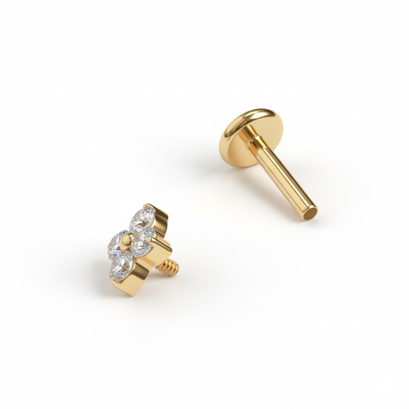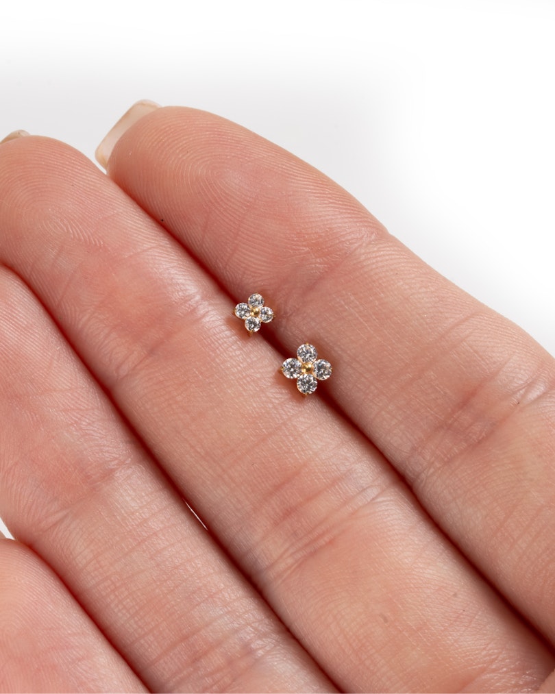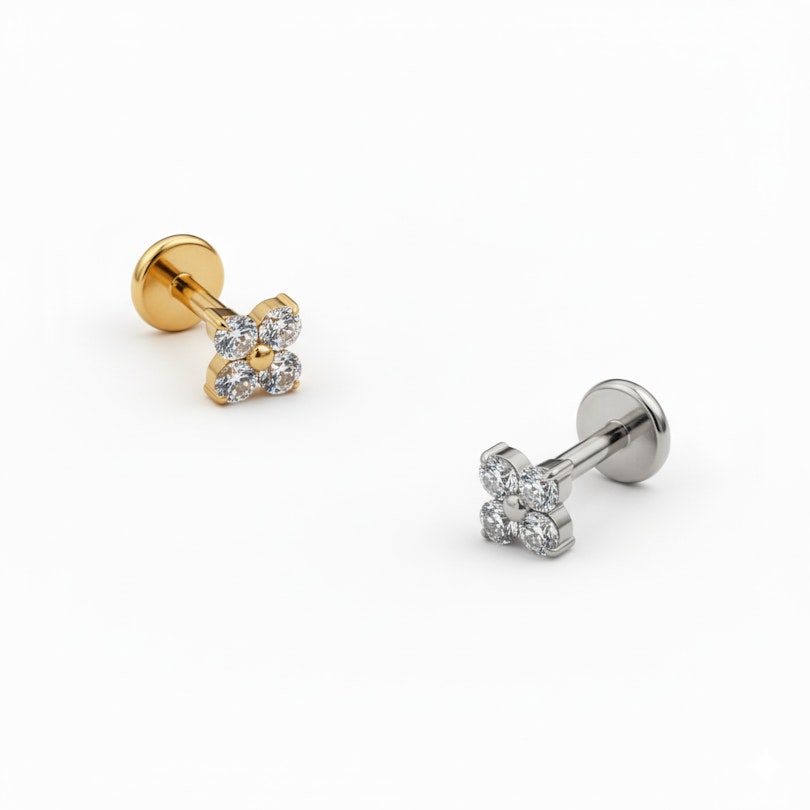 Denna titanlabret med miniatyrblomma ger en mjuk, blommande touch av små stenar som tillsammans bildar en blomma. Stenarna sitter i en prydlig klofattning och ligger nära huden, vilket ger detalj utan att kännas tungt. Finns i guld- och silverfärg och i två storlekar — den mindre håller det diskret medan den större ger lite mer närvaro. Tillsammans skapar de en enkel lager-på-lager-look som ändå känns genomtänkt.