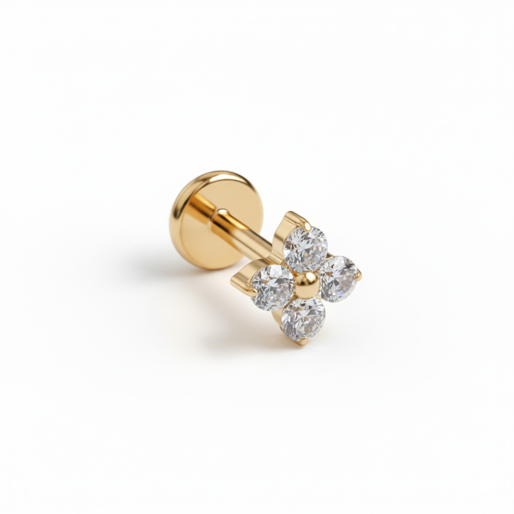 Denna titanlabret med miniatyrblomma ger en mjuk, blommande touch av små stenar som tillsammans bildar en blomma. Stenarna sitter i en prydlig klofattning och ligger nära huden, vilket ger detalj utan att kännas tungt. Finns i guld- och silverfärg och i två storlekar — den mindre håller det diskret medan den större ger lite mer närvaro. Tillsammans skapar de en enkel lager-på-lager-look som ändå känns genomtänkt.