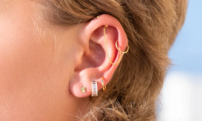Dess trådtjocklek på 1,2 mm och diameter på 8 mm gör att den passar i de flesta öronpiercingar. Stenarna är 4 mm breda.