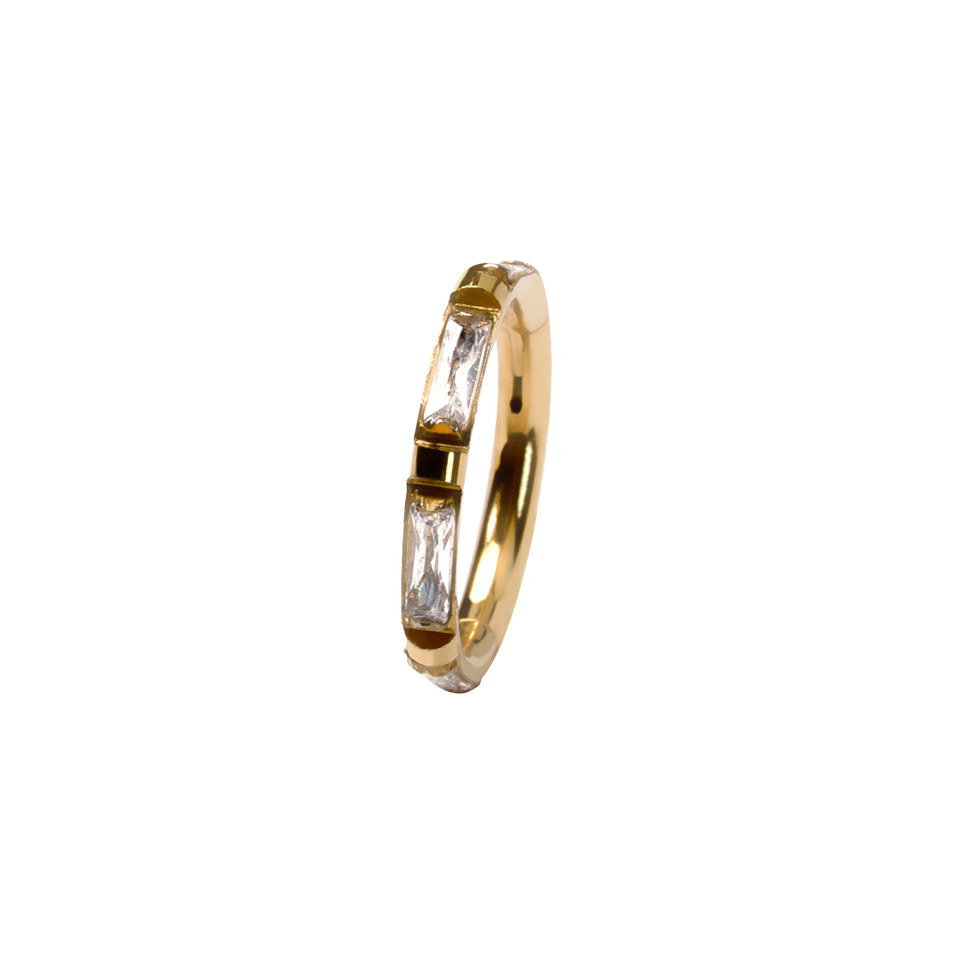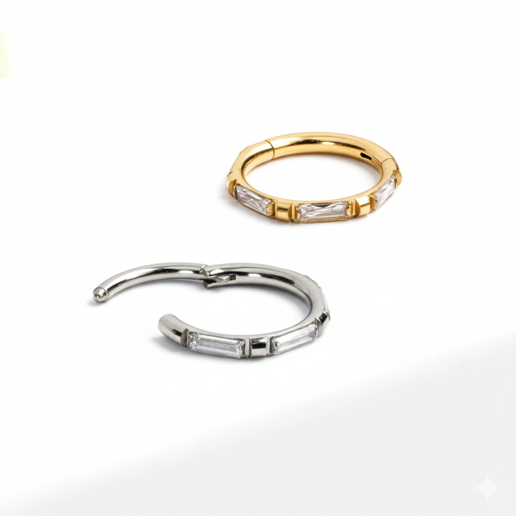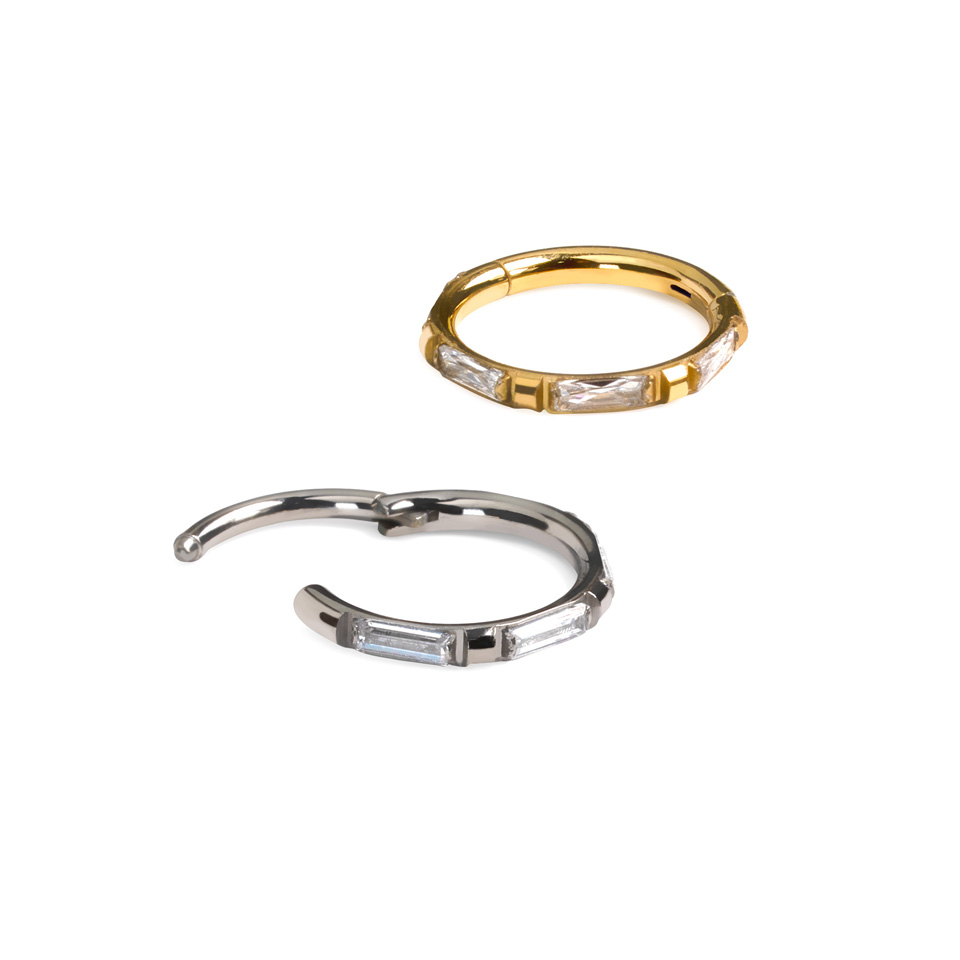 Denna titanringen med baguetteslipade stenar har en snygg design av varierande baguetteslipade rektangulära CZ-stenar och små fyrkanter av metal på utsidan av ringen. Med sitt gångjärnslås är den enkel att sätta i din piercing. Tillverkad av titan, vilket gör den allergivänlig, slitstark och vattentät.