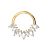 Denna vackra ring består av 9 marquise-slipade CZ-stenar i ett mönster med små och stora storlekar. Detta smycke är idealt för piercingar där du vill designen på framsidan av ringen i stället för på sidan, som för semptum eller daith. Den har gångjärnslås, vilket betyder att det är väldigt enkelt att trä på den på din piercing. Den är tillverkad i titan, så den passar även de med känslig hud.