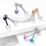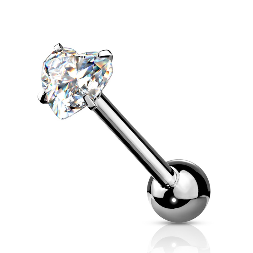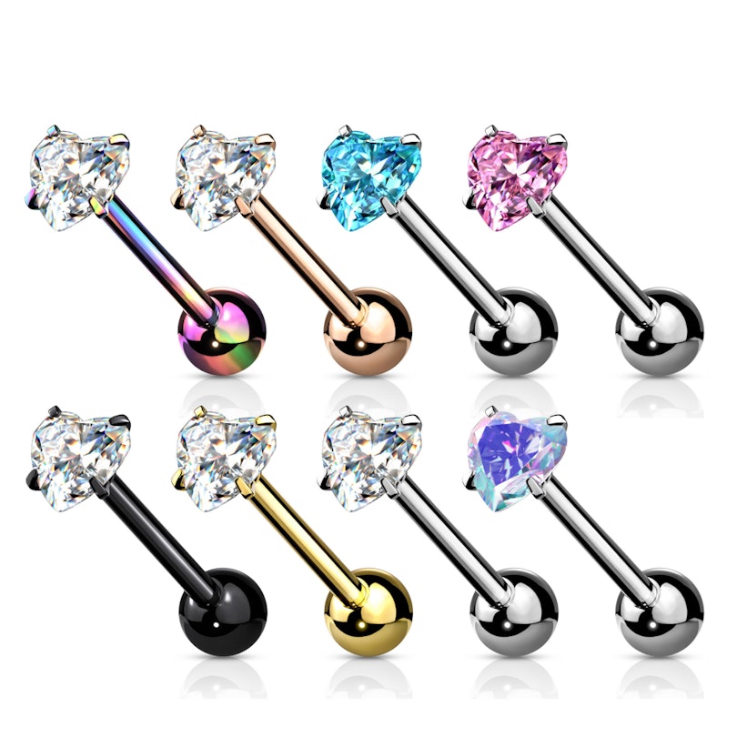 Tungpiercingen har ett platt stenhjärta överst på staven. I den motsatta änden av den 16 mm långa staven sitter en låskula. Hjärtat är fast och kan inte skruvas av. Det kan däremot låskulan. Kulan och staven har samma färg. Färgen väljer du själv från de färger du ser på bilden. Bara den blanka utgåvan finns med olika stenhjärt färger.