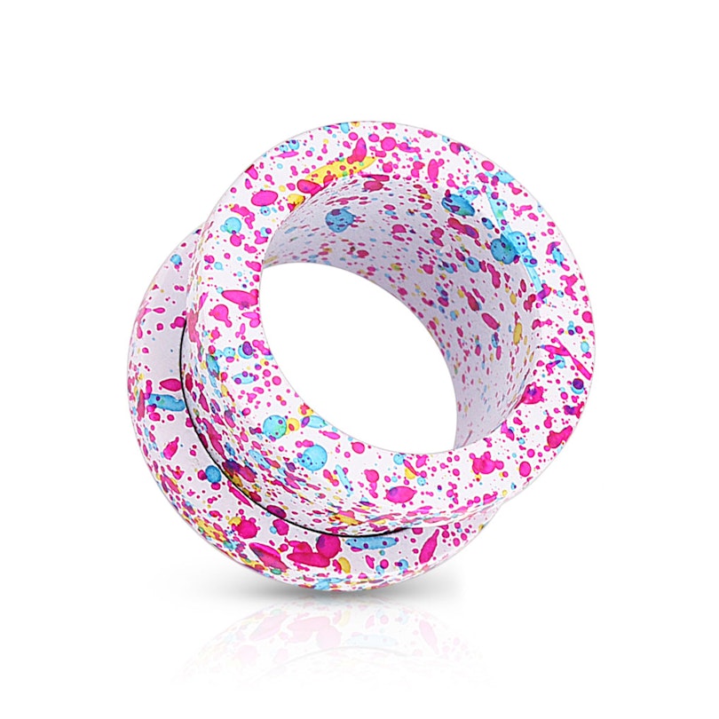 Här är helt rätt tunnel till dig som älskar kul och färger i dina töjningssmycken. Denna häftiga tunnel är gjord av kirurgiskt stål och finns i många olika storlekar och färger, från 3 mm i diameter ända upp till 16 mm. Den snygga tunneln är designad så att det ser ut som om en målarpensel med alla världens färger som just har ritat rakt över smycket. De snygga stänkfläckarna hålls i färger som alla komplimenterer varandra riktigt bra rent färgmässigt.