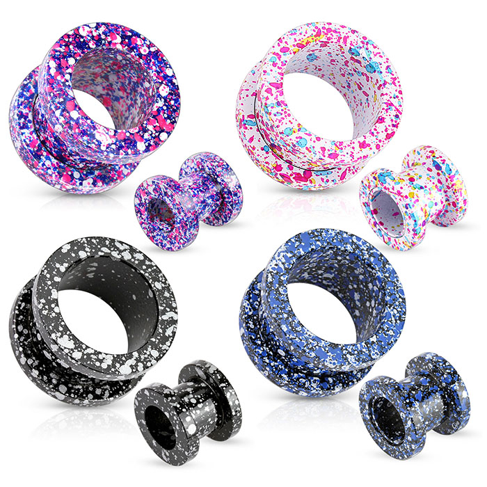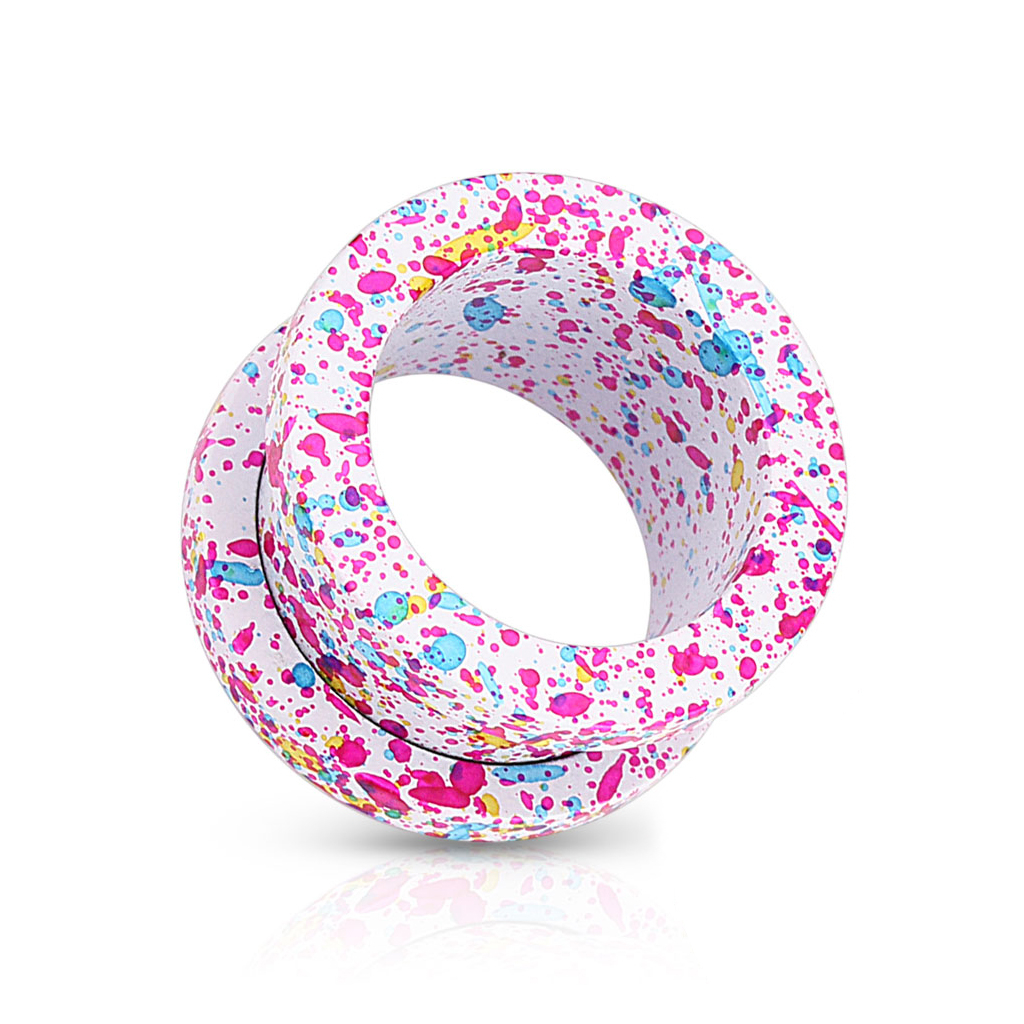 Här är helt rätt tunnel till dig som älskar kul och färger i dina töjningssmycken. Denna häftiga tunnel är gjord av kirurgiskt stål och finns i många olika storlekar och färger, från 3 mm i diameter ända upp till 16 mm. Den snygga tunneln är designad så att det ser ut som om en målarpensel med alla världens färger som just har ritat rakt över smycket. De snygga stänkfläckarna hålls i färger som alla komplimenterer varandra riktigt bra rent färgmässigt.