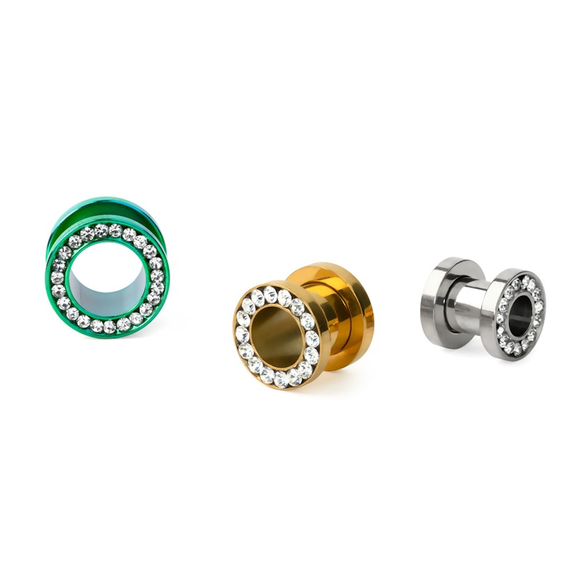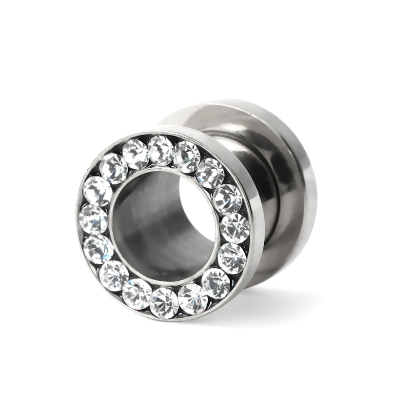 Läcker klassisk tunnel som är tillverkad av kirurgiskt stål som här finns i en hel värld av olika storlekar och färger. Gemensamt för alla modellerna är att de är prydda med små facetterade stenar hela vägen runt i kanten där de sitter i en perfekt cirkel och gnistrar vackert när ljuset träffar dem. Det är verkligen lite för varje smak samt nästan alla töjningsstorlekar här.