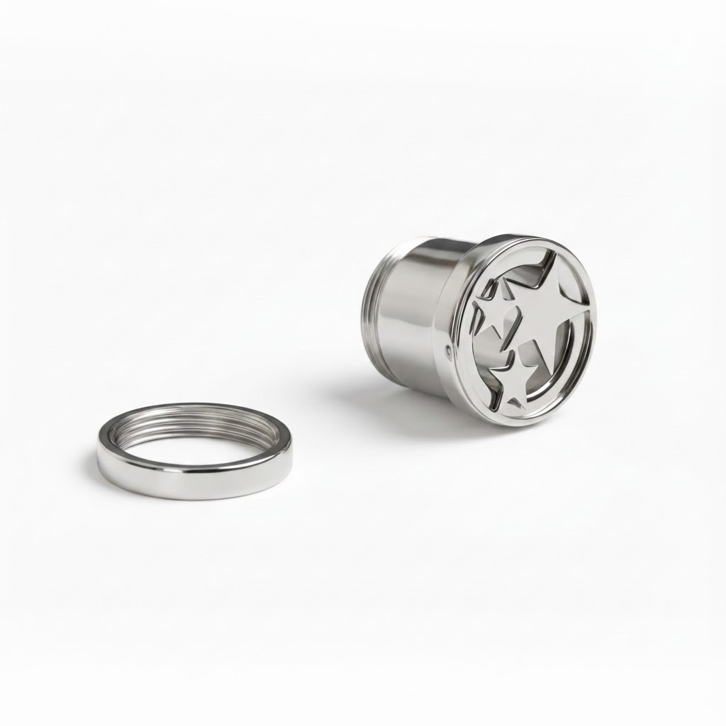 Tillverkad i kirurgiskt stål, vilket gör den slitstark, vattentät och passar de flesta hudtyper. Yttre gänga gör allt enkelt: trä i tunneln, skruva på bakstycket och du är klar.