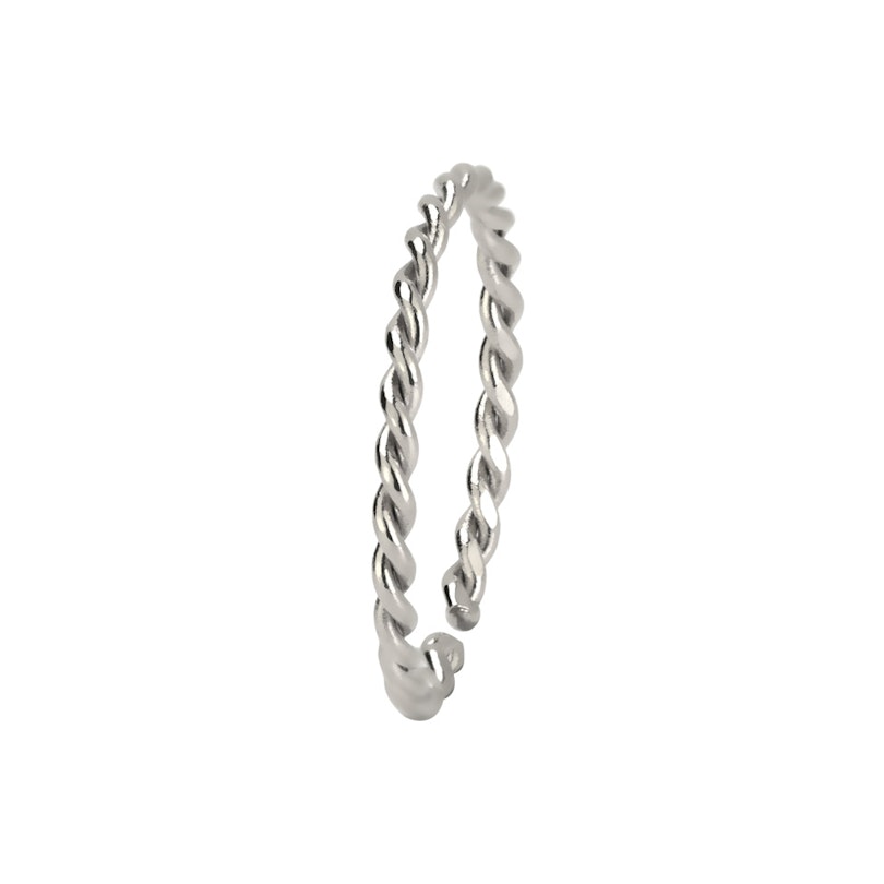 Denna ring är en härlig variant av den populära oändliga ringen. Klassikern är ett stycke metall med kopplade ändar. Denna modell består av två metalliska bitar som har blivit tvistade vilket ger en flätat effekt. Ändarna har blivit svetsade en aning och rundade för att enklare kunna sättas in i piercingen och förhindra att delarna faller isär.