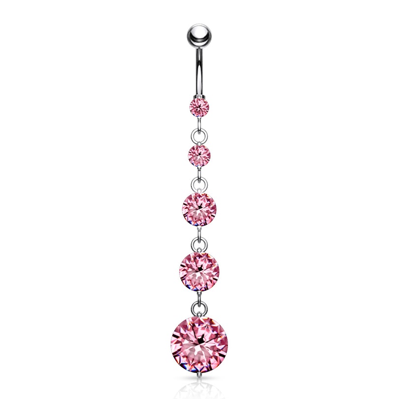 Navelpiercingens stav är 10 mm. lång och är gjort av det vanligaste smyckematerial, kirurgiskt stål. På toppen av staven sitter en helt vanlig toppkula. I botten av staven har vi det långa snygga hänge där du själv bestämmer färgen på stenarna.